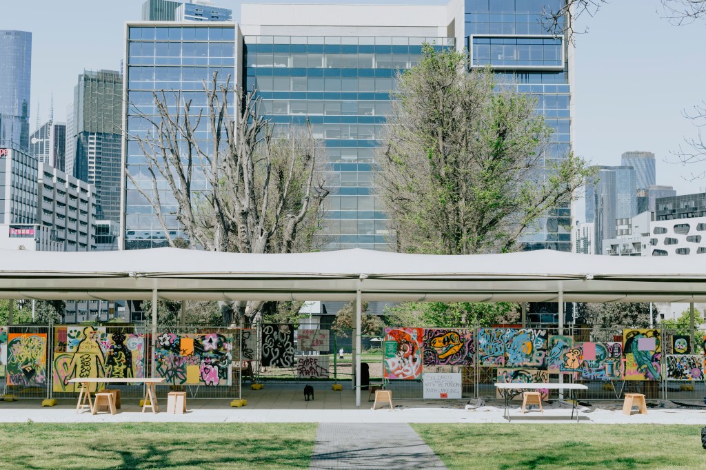 We densified the MPavilion’s slender modernist structure by adding a fence with coloured boards around it and inviting people to leave their marks by stitching fabrics, buffing, pasting posters, and drawing and writing with spray paint and poscas.